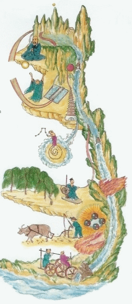 De ontwerper, Hans van Asseldonk, heeft met behulp van tulpen- en narcissenbollen onderdelen en energiebanen van een menselijk lichaam in de tuin aangebracht. Hij werd hiertoe geïnspireerd door de taoïstische natuurvisie, waarin het landschap wordt ervaren als het eigen lichaam of het lichaam als een landschap. Deze verbeelding wordt uitgedrukt in een oude taoïstische figuur, die het menselijk lichaam als een embryo weergeeft, met daarin landschappelijke elementen, als bergen, rivier, moerbeibosje, gebouwen, en ook mensen. De figuur heet 'het innerlijke landschap', zoals in de kleurenafbeelding hieronder weergegeven. De zwartwit-afbeelding laat zien hoe dit 'innerlijke landschap' is vertaald in de plattegrond van de taotuin.